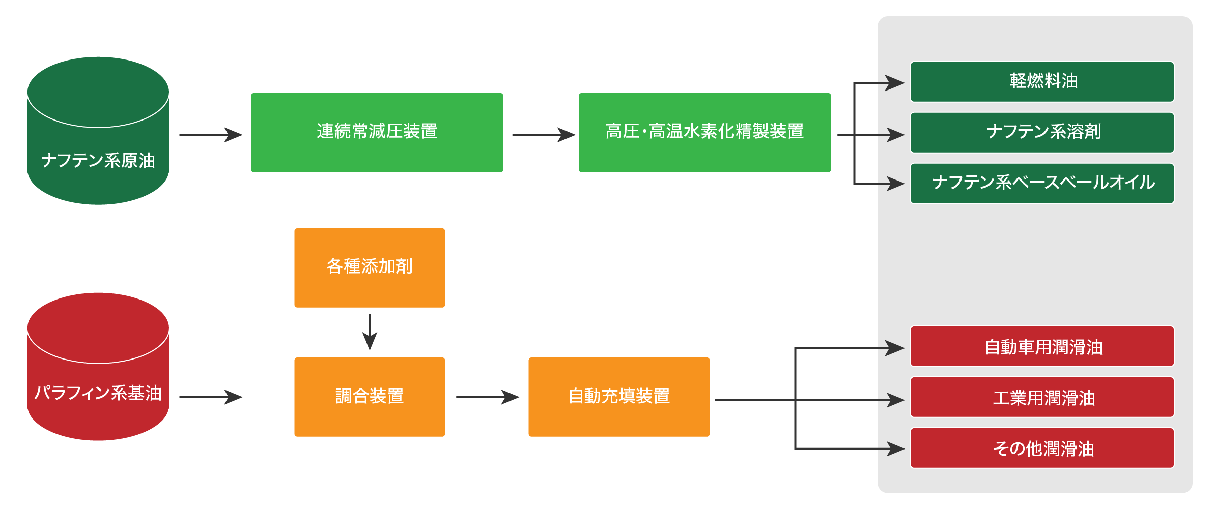 各種潤滑油の大ロット・ブレンドから小ロット・ブレンドまで、あらゆる生産体制を備えています。